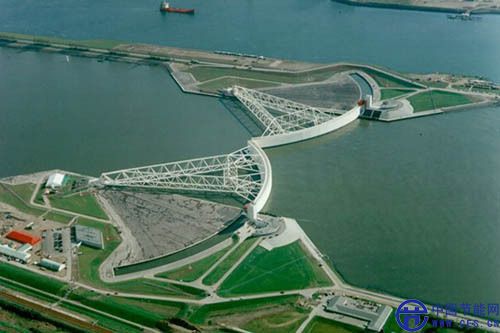 位于鹿特丹新航道西端的馬仕朗防風(fēng)暴大壩是本世紀(jì)世界上最大的水壩工程,它的非凡之處在于它的兩個(gè)球形轉(zhuǎn)軸可以分別水平和垂直移動(dòng)兩個(gè)閘門,使大壩成為浮動(dòng)式建筑,從而既保證了鹿特丹港的暢通,又保證了南荷蘭省超過百萬居民的安全。
