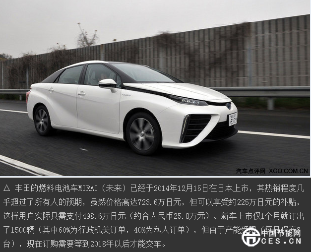 △ 豐田的燃料電池車MIRAI(未來)已經(jīng)于2014年12月15日在日本上市,其熱銷程度幾乎超過了所有人的預期,雖然價格高達723.6萬日元,但可以享受約225萬日元的補貼,這樣用戶實際只需支付498.6萬日元(約合人民幣25.8萬元)。新車上市僅1個月就訂出了1500輛(其中60%為行政機關訂單,40%為私人訂單),但由于產(chǎn)能受限(每日僅產(chǎn)3臺),現(xiàn)在訂購需要等到2018年以后才能交車。