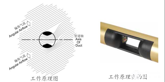 感應(yīng)器孔的塑形是經(jīng)過精心設(shè)計(jì)的,最大限度地減少自然存在于任何管道內(nèi)的偏角氣流影響;喇叭型孔的感應(yīng)管使之成為代表性的樣品, 而輪廓上流面的設(shè)計(jì),可防止漩渦產(chǎn)生。孔徑中間橫截面的功能相當(dāng)于一個(gè)文丘里管,這種設(shè)計(jì)在檢測位置會(huì)穩(wěn)定和拉平流速偏差,從而確保氣流可充分接觸感應(yīng)電熱調(diào)節(jié)器的測點(diǎn);通過檢測孔的氣流調(diào)直特性,可補(bǔ)償紊流氣流(螺距和偏搖角度達(dá)到±30°),這也就使各ELECTRA-flo – EF熱式儀器檢測氣流量的誤差度僅為±2%。(工作原理圖如下)