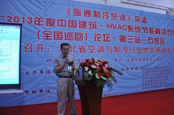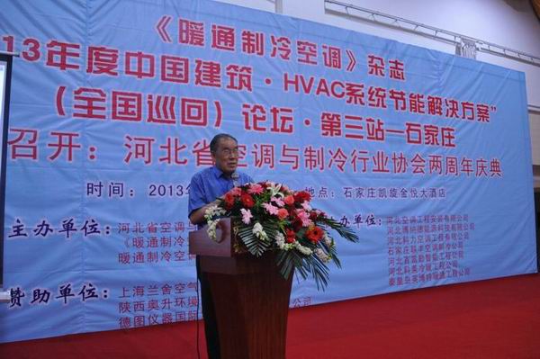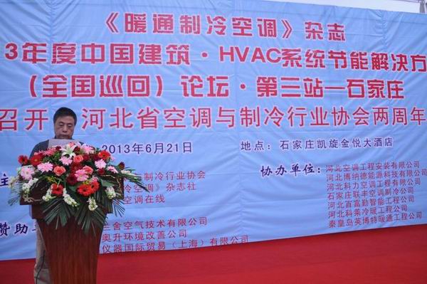 2013年6月21日至22日,河北省空調(diào)與制冷行業(yè)協(xié)會兩周年慶典暨“2013年度中國建筑·暖通空調(diào)系統(tǒng)節(jié)能解決方案(全國巡回)論壇”在石家莊市凱旋金悅大酒店召開,大會安排年會、論壇、展覽、參觀四項(xiàng)內(nèi)容。出席會議的有河北省第九屆人大常委會副主任,河北省書法家協(xié)會名譽(yù)主席龔煥文、河北省第十屆人大常委會副主任韓葆珍、河北省工經(jīng)聯(lián)副秘書長蘇輝、中國建筑學(xué)會暖通空調(diào)分會名譽(yù)理事長吳元煒、中國建筑學(xué)會暖通空調(diào)分會副理事長吳德繩、中國建筑金屬結(jié)構(gòu)協(xié)會地面輻射供暖委員會專家組組長鄧有源、河北省制冷學(xué)會理事長方國昌、山西制冷協(xié)會會長來可經(jīng)、湖北省空調(diào)制冷協(xié)會秘書長張定國、中國設(shè)備管理協(xié)會全國空調(diào)系統(tǒng)檢測技術(shù)服務(wù)中心副主任席夫建、中冷協(xié)空工委陜西工作站站長王峰,以及來自全國各地的暖通空調(diào)設(shè)計(jì)、科研院所、大專院校、媒體記者及業(yè)內(nèi)生產(chǎn)經(jīng)營企業(yè)代表和社會各界人士近2百人