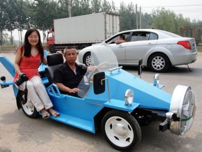 2012年5月19日,北京市通州永樂店鎮(zhèn)半截河農(nóng)民唐振平正在鄉(xiāng)村道路上試跑自制的外形酷似法拉利賽車又頗具環(huán)保意識的“敞篷”風電跑車,一美女記者坐上“敞篷跑車”,親自體驗下這拉風的感覺,引發(fā)眾人好奇的目光。