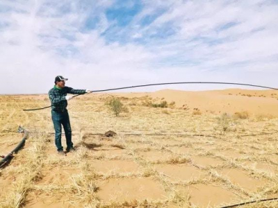 再在草方格上鋪設滴灌管道。在滴灌的滴頭位置上種樹,控制每一棵苗的補水量,保證它自然生長。這些苗需補水3年,第一年補水次數(shù)3到4次,一次補水20升左右,每年遞減,3年后就不用補水了。(一條提供)