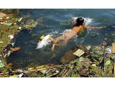 在北方平壩上,一名孩童在污染的水庫中游泳嬉戲,看得讓人心痛啊!