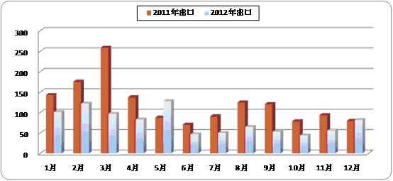 由于國(guó)際煤價(jià)低于國(guó)內(nèi),同時(shí)考慮到我國(guó)相關(guān)稅率政策的調(diào)控,2012年我國(guó)煤炭出口量持續(xù)保持低位。全年只有1、2、5三個(gè)月煤炭當(dāng)月出口量超過(guò)100萬(wàn)噸,出口量最少的10月份僅有44萬(wàn)噸。全年煤炭出口總量不足1000萬(wàn)噸,僅有926萬(wàn)噸,較去年同期減少539.2萬(wàn)噸,下降36.8%。12月份當(dāng)月出口均價(jià)為165.7美元/噸,比去年同期下降31美元/噸,比1月份下降了16.6美元/噸,比上月增長(zhǎng)14.5美元/噸;當(dāng)月出口金額僅為13585萬(wàn)美元,同比下降13.6%。全年累計(jì)出口金額由去年的27.16億美元降至15.86億美元,下降41.6%,累計(jì)出口均價(jià)為173.3美元/噸,同比下降14美元/噸。我國(guó)煤炭全年實(shí)現(xiàn)凈進(jìn)口27925噸,同比增加11151萬(wàn)噸,增長(zhǎng)高達(dá)66.5%。