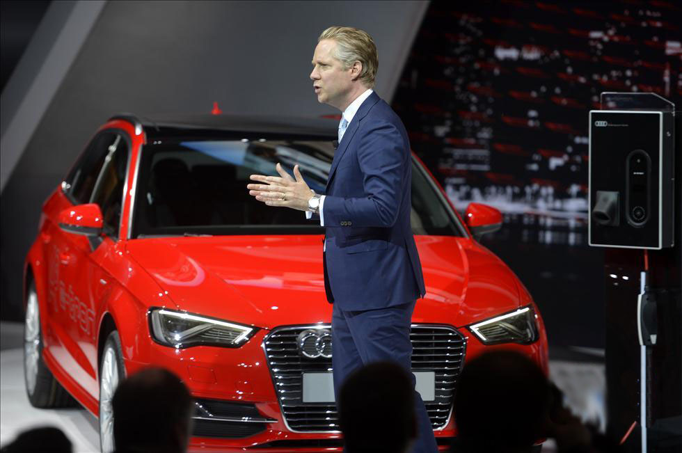 4月16日,奧迪北美地區(qū)總裁斯科特·基奧在紐約國(guó)際車(chē)展上介紹新推出的柴油版奧迪A3轎車(chē)。新華社記者王雷攝 當(dāng)日,2014年紐約國(guó)際車(chē)展進(jìn)行媒體日預(yù)展。奧迪和大眾分別發(fā)布了新款柴油版A3和Jetta系列。2014紐約國(guó)際車(chē)展將于4月18日至27日對(duì)公眾開(kāi)放。