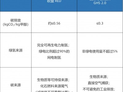 2023年,歐盟通過其《可再生能源指令》(RED)新增條款,而國際綠氫組織則在其第二版綠氫標(biāo)準(zhǔn)(GHS 2.0)中設(shè)立了綠色甲醇專項(xiàng)標(biāo)準(zhǔn),兩大權(quán)威機(jī)構(gòu)均首次推出了綠氫制甲醇的相關(guān)規(guī)范。這兩份標(biāo)準(zhǔn)均對(duì)綠氫制甲醇燃料的碳排放和原料來源進(jìn)行了初步界定。