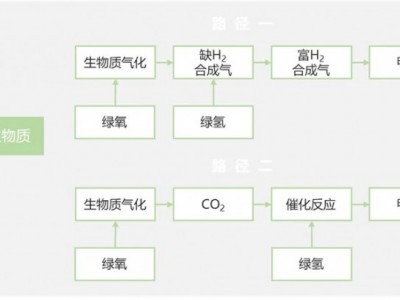 “綠氫+生物質(zhì)”技術(shù)結(jié)合了生物質(zhì)氣化提供的碳源與綠氫來合成甲醇。該技術(shù)存在兩條路徑:一是利用秸稈等生物質(zhì)通過氣化生成CO與少量H2,隨后引入綠氫調(diào)整CO與H2比例以生產(chǎn)甲醇;二是先將生物質(zhì)氣化為二氧化碳,再與綠氫結(jié)合生產(chǎn)甲醇。