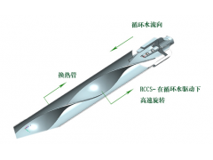 在列管式換熱器每根換熱管內(nèi)安裝RCCS裝置,當(dāng)設(shè)備運(yùn)行時(shí),無需外加動(dòng)力,利用循環(huán)工質(zhì)自身的流速驅(qū)動(dòng)本裝置的旋轉(zhuǎn)部件,使RCCS裝置長期在換熱管內(nèi)以300-1800r/min的轉(zhuǎn)速持續(xù)快速旋轉(zhuǎn),從而改變管內(nèi)工質(zhì)的層流為紊流狀態(tài),強(qiáng)化換熱,大幅度提高換熱器的換熱系數(shù)K值20%以上。同時(shí),破壞換熱管內(nèi)垢的形成機(jī)理,使垢不能在管壁上滯留和附著。RCCS在設(shè)計(jì)思路上打破了傳統(tǒng)的被動(dòng)清洗除垢概念,變傳統(tǒng)被動(dòng)除垢為主動(dòng)防垢,并實(shí)現(xiàn)強(qiáng)化換熱。
