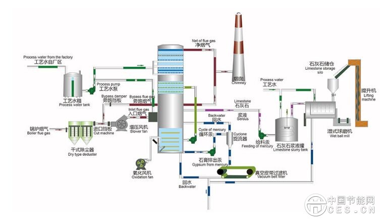 煙氣從煙道引出后經(jīng)增壓風(fēng)機增壓,經(jīng)預(yù)噴淋處理冷卻后進入收塔。煙氣在吸收塔中與噴淋的石灰石/石灰漿液充分接觸,除去煙氣中的SO2,潔凈煙氣從吸收塔頂部排出,再經(jīng)煙囪排放至大氣中。脫硫劑石灰石/石灰經(jīng)過破碎、研磨、制成漿液后輸送到吸收塔。吸收塔內(nèi)漿液經(jīng)循環(huán)泵送到噴淋裝置噴淋。吸收塔內(nèi)吸收SO2后生成的亞硫酸鈣,經(jīng)氧化處理生成硫酸鈣,從吸收塔內(nèi)排出的硫酸鈣經(jīng)旋流分離(濃縮)、真空脫水后回收利用。該技術(shù)是目前全球范圍內(nèi)大型燃煤鍋爐應(yīng)用最廣泛的煙氣脫硫技術(shù)。