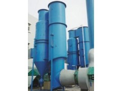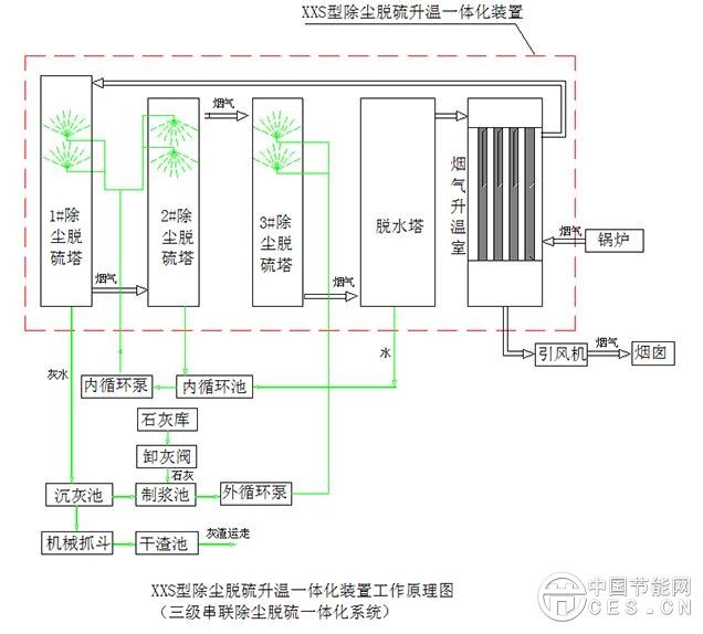 三級脫硫裝置由五個主要部分組成:1#除塵脫硫筒、2#除塵脫硫筒、3#除塵脫硫筒、脫水筒、升溫室。煙氣從煙氣進口進入沉降升溫室后,依次進入1#除塵脫硫筒、2#除塵脫硫筒,3#除塵脫硫筒,使煙氣成為高速旋轉氣流,在高速旋轉氣流中噴入堿性水,利用我公司發(fā)明的多道逆向噴淋法使水氣充分接觸,煙氣達到除塵脫硫筒底部再經水筒螺旋上升脫水,避免煙氣帶水進入鍋爐引風機。煙氣經脫水后回到升溫室與除塵脫硫前的高溫煙氣進行熱交換,對除塵脫硫后煙氣進行再升溫,從而有效解決低溫潮濕煙氣造成引風機等的腐蝕、積灰和振動問題。三級脫硫效率可達95%以上。