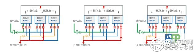 第一周期,在第一室吸氣,蓄熱體放熱,廢氣升溫,從第二室排氣,蓄熱體蓄熱,廢氣降溫,第三室用處理后的氣體進(jìn)行反吹,清理蓄熱室內(nèi)未處理完成的廢氣。