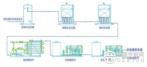 預(yù)處理 → 生化處理 → MBR → NF → RO → 濃縮液蒸發(fā)系統(tǒng)