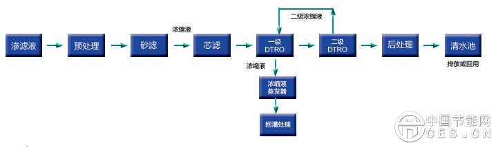 預(yù)處理 → 生化處理 → DTRO → DTRO → 濃縮液蒸發(fā)系統(tǒng)