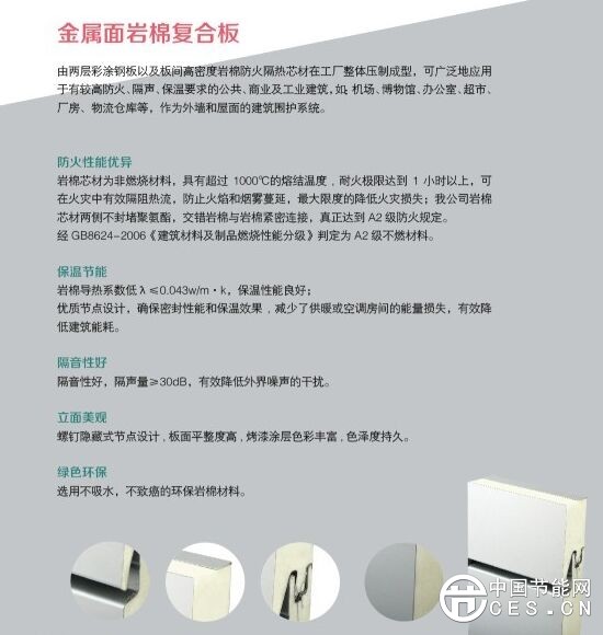 金屬面巖棉復(fù)合板:由兩層彩涂鋼板及板間高密度巖棉防火隔熱芯材在工廠整體壓制成型,可廣泛地應(yīng)用于有較高防火、隔聲、保溫要求的公共、商業(yè)及工業(yè)建筑,如:機場、博物館、辦公室、超市、廠房、物流倉庫等,作為外墻和屋面的建筑圍護系統(tǒng)。