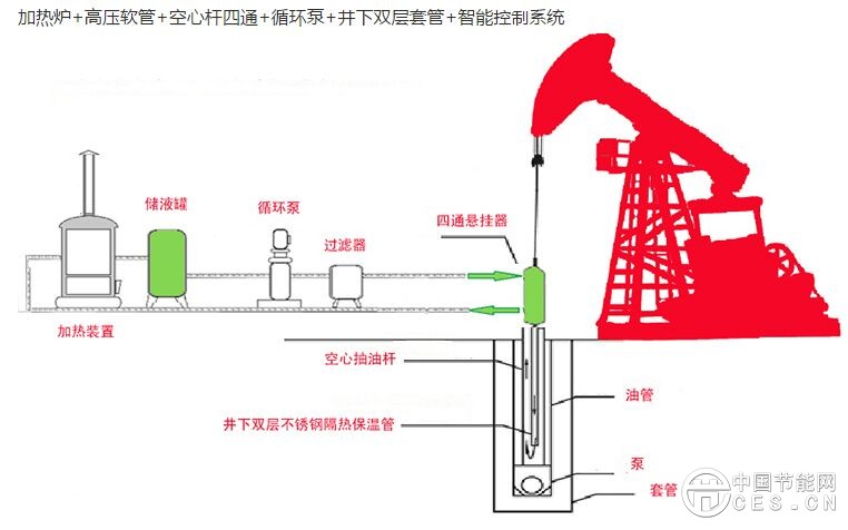自主研發(fā)的油田廢氣利用系統(tǒng),其原理是利用油田開采中產(chǎn)生的有機廢氣,通過小型天然氣鍋爐加熱軟化循環(huán)水,利用套管傳熱循環(huán)加熱稠油,減少了二次能源的消耗和Vocs的排放,讓“廢氣”變“福氣”。