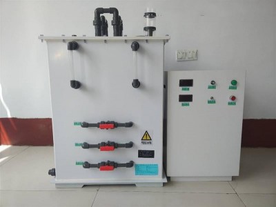 該設(shè)備主要組成部分:鹽箱、發(fā)生器主機(電解槽、陽極板、陰極板、電解隔膜、水射器、電解液雙路循環(huán)系統(tǒng)、冷卻系統(tǒng))以及電解電源。