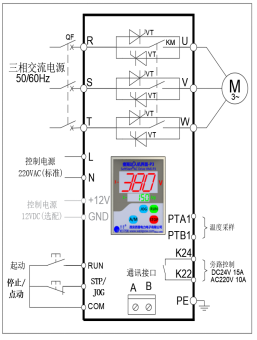 內(nèi)置旁路(二合一):工頻旁路(或輕載節(jié)能)+變頻式軟起動器