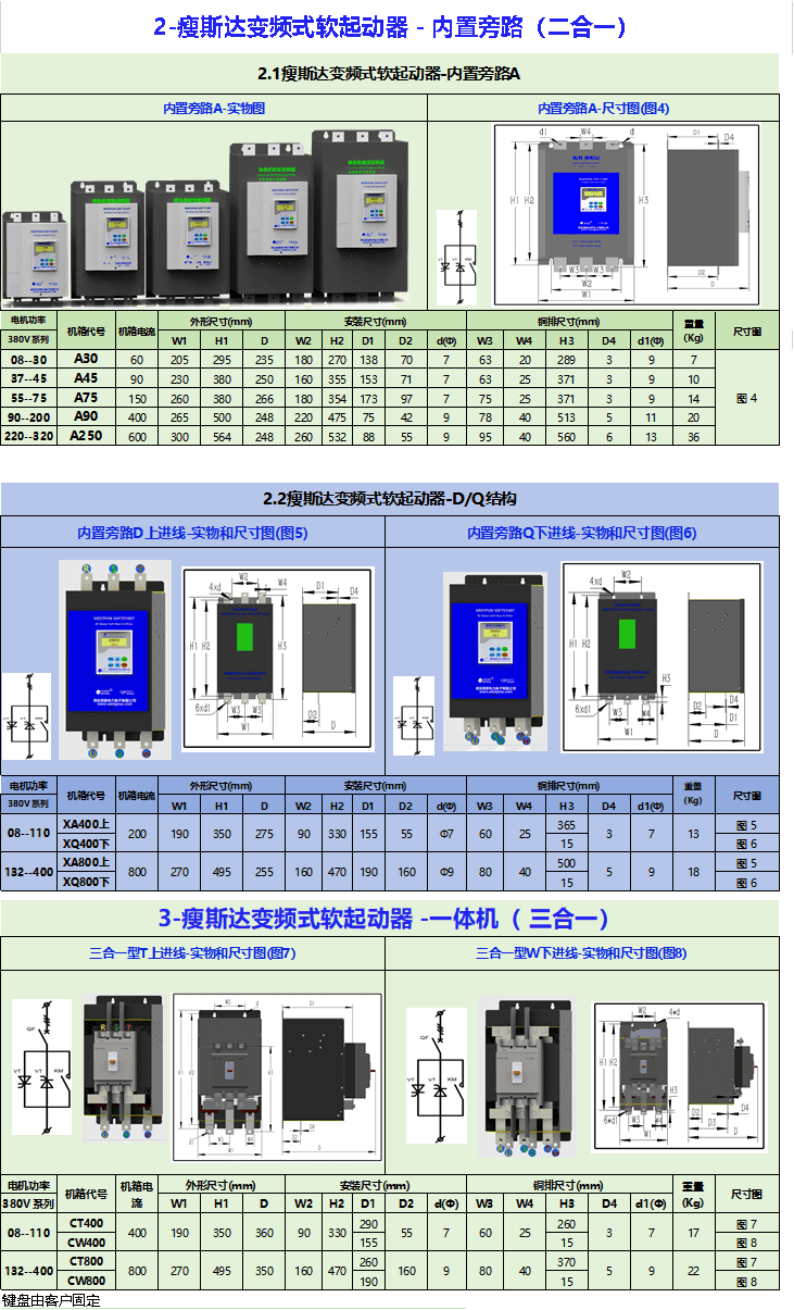 一體機(三合一):空開+工頻旁路(或輕載節(jié)能)+變頻式軟起動器(參考瘦斯達-S)
