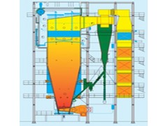 鍋爐由前部及尾部二個豎井煙道組成。前部豎井為懸吊結構,四周由膜式水冷壁組成。自上而下依次為一次風室、濃相床,懸浮段、水冷屏、二級省煤器。尾部豎井采用支撐結構,布置有一級省煤器及管式空氣預熱器。兩豎井之間由兩個并列的旋風分離器相連通,分離器下部接回送裝置及螺旋除灰器。燃燒室及分離器內部均設有防磨內襯,前者采用敷管爐墻,外置金屬護板;后部豎井采用輕型爐墻。由八根立柱承受鍋爐全部重量。