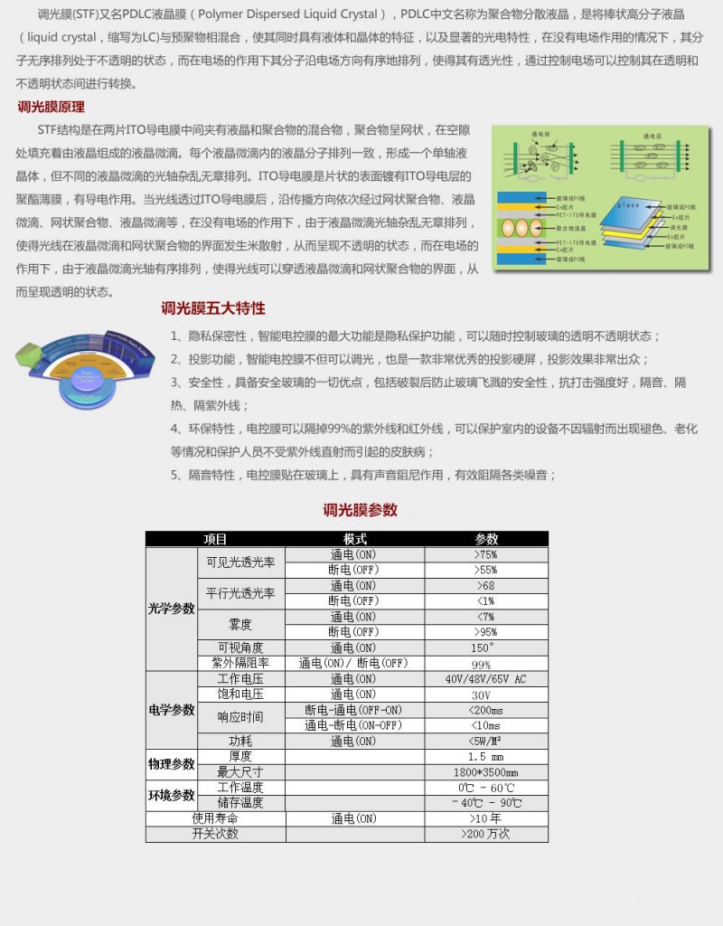 通電透明,斷電處于不透明狀態(tài),自由切換,簡潔方便。 可根據(jù)窗外溫度及光線的變化,通過旋轉(zhuǎn)調(diào)壓按鈕,自動調(diào)整自身的光線強(qiáng)弱及紅外線透過率,達(dá)到調(diào)溫調(diào)光的效果。具有高抗紫外線性能,環(huán)保又保健。