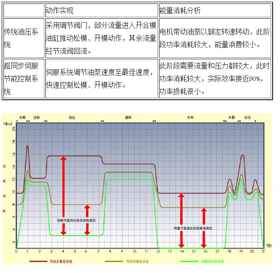 注塑機(jī)的用電量主要消耗在油泵電機(jī)上,在定量泵的液壓系統(tǒng)中,電機(jī)以50Hz高速運(yùn)轉(zhuǎn),油泵的供油量基本不變,遠(yuǎn)遠(yuǎn)大于注塑機(jī)工況的時間要求,多余的高壓油經(jīng)溢流閥全部回流至油箱,能量存在巨大的浪費(fèi)。我們可以采用超同步伺服節(jié)能控制系統(tǒng),使注塑機(jī)在不同工作階段伺服電機(jī)輸出功率,根據(jù)負(fù)載變化而變化,不存在多余能量浪費(fèi)。保壓和冷卻階段,能耗低級,幾乎為零。