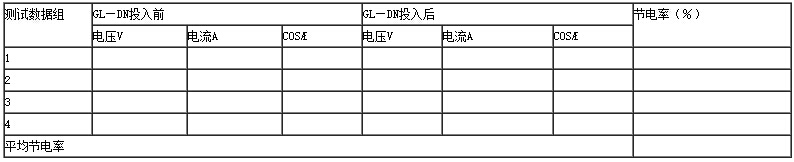 安裝后在同等狀況、同一測試點(diǎn),用測試儀測量電流、功率因素,也可由節(jié)電器側(cè)面的(節(jié)電――旁路)選擇開關(guān)進(jìn)行節(jié)電測試對比。測試表如下: