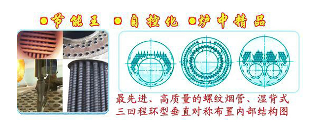 ★ 爐膛上部采用最先進(jìn)、高質(zhì)量的螺紋煙管、濕背式三回程環(huán)型垂直對(duì)稱(chēng)布置結(jié)構(gòu)?;鹧嬖诟吡魉俚囊L(fēng)下在管內(nèi)繞旋運(yùn)動(dòng),管內(nèi)螺紋有效阻止并延長(zhǎng)了火焰通道和經(jīng)過(guò)時(shí)間,通過(guò)多回程上下反復(fù)流動(dòng)燃燒,使熱能與水充分換熱,是普通管的2倍左右,達(dá)到排煙溫度150℃左右的低溫排放,從而達(dá)到節(jié)能效果最佳程度,鍋爐尾部采用旋風(fēng)脫硫除塵技術(shù)有效去除尾氣殘余和有害物質(zhì),達(dá)到環(huán)保排放要求。