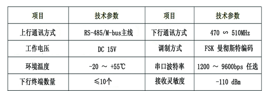 用于“溫度面積法”的非閥控方案,與樓棟熱量表、室溫傳感器、采集計(jì)算器及管理中心計(jì)算機(jī)軟硬件共同組成“溫度面積法”的采集、傳輸及計(jì)費(fèi)系統(tǒng),是采集和傳輸通訊的中繼裝置。其在樓棟單元的樓道內(nèi)安裝(相鄰樓層4—6戶共用一臺(tái)),集中采集接收室溫傳感器的室溫信息,下行通過470—510MHz短距離微功耗無線通信方式與室溫傳感器聯(lián)系,上行RS-485/M-BUS總線方式與樓棟采集計(jì)算器通訊。
