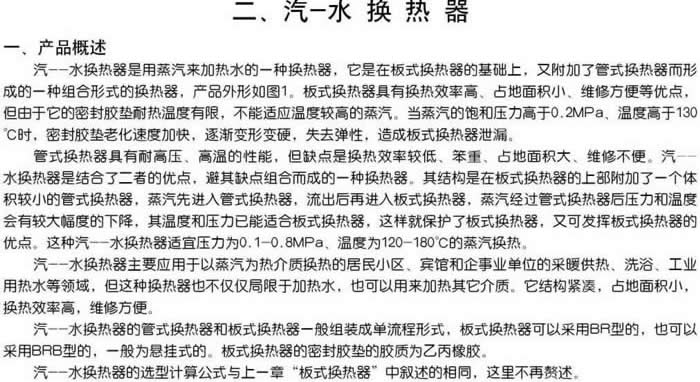 汽--水換熱器是用蒸汽來加熱水的一種換熱器,它是在板式換熱器的基礎(chǔ)上,又附加了管式換熱器而形成的一種組合形成的換熱器,板式換熱器具有換熱效率高、占地面積小、維修方便等優(yōu)點(diǎn),但由于它的密封膠墊耐熱溫度有限,不能適應(yīng)溫度高的蒸汽。