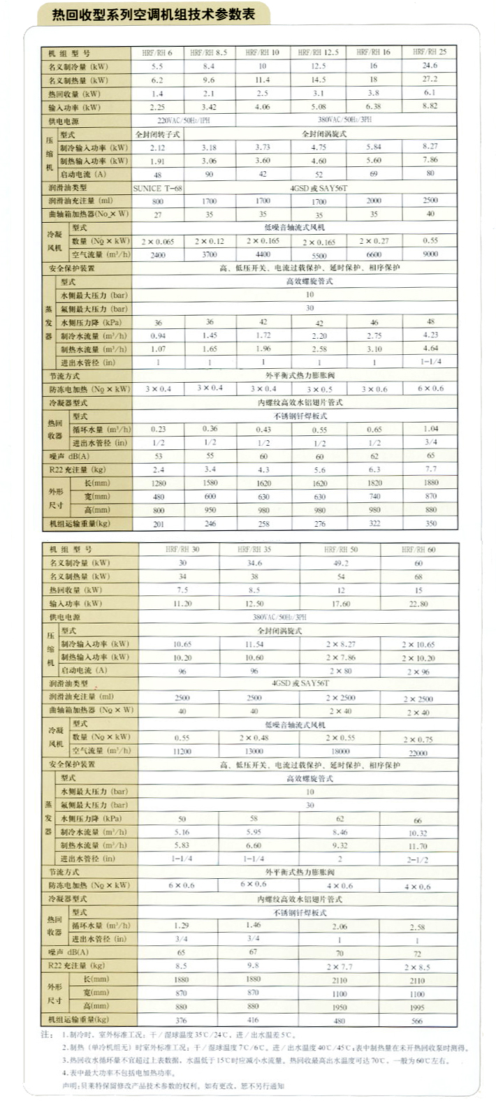 H(R)F/RH系列機(jī)組是帶有熱回收的定頻水機(jī)可提供生活用水,其體積小、安裝靈活方便,分單冷型和熱泵型共22種規(guī)格。