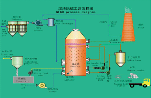 它的工作原理是:將石灰石粉加水制成漿液作為吸收劑泵入吸收塔與煙氣充分接觸混合,煙氣中的二氧化硫與漿液中的碳酸鈣以及從塔下部鼓入的空氣進行氧化反應(yīng)生成硫酸鈣,硫酸鈣達到一定飽和度后,結(jié)晶形成二水石膏。經(jīng)吸收塔排出的石膏漿液經(jīng)濃縮、脫水,使其含水量小于10%,然后用輸送機送至石膏貯倉堆放,脫硫后的煙氣經(jīng)過除霧器除去霧滴,再經(jīng)過換熱器加熱升溫后,由煙囪排入大氣。由于吸收塔內(nèi)吸收劑漿液通過循環(huán)泵反復循環(huán)與煙氣接觸,吸收劑利用率很高,鈣硫比較低,脫硫效率可大于95%。