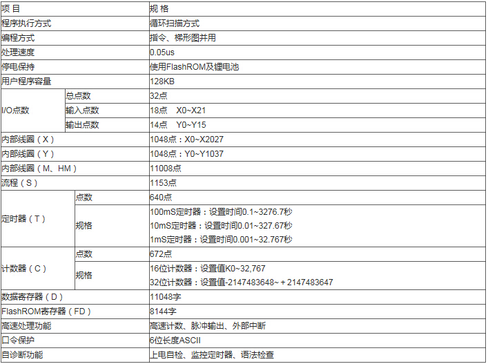 18點NPN型輸入,14點繼電器(R)或晶體管(T)或繼電器晶體管混合(RT)輸出 AC220V(E)或DC24V(C)電源 最多可外接擴(kuò)展10個模塊和3塊BD板 具有更高的處理速度(XC系列10倍) 帶時鐘并對數(shù)據(jù)進(jìn)行掉電保持 支持基本的邏輯控制和數(shù)據(jù)運(yùn)算 支持高速計數(shù)、脈沖輸出、外部中斷、電子凸輪、C語言編輯功能塊、I/O點的自由切換、自由格式通訊、MODBUS通訊等功能