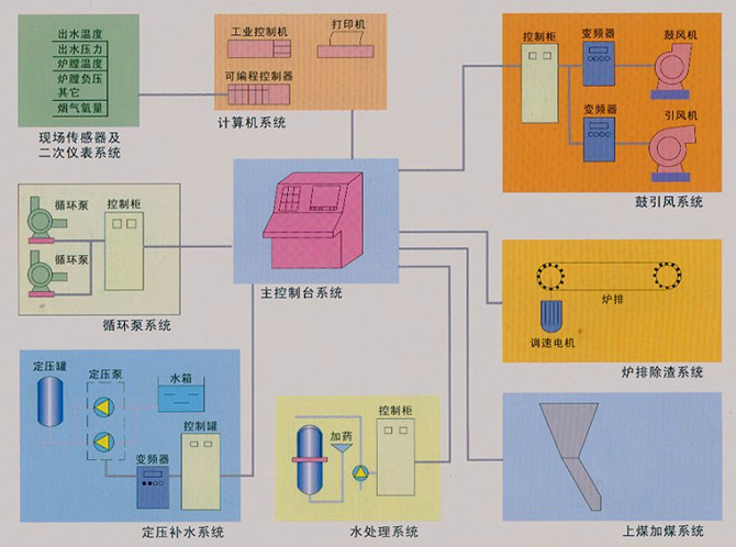 我公司設(shè)計(jì)開(kāi)發(fā)的鍋爐自動(dòng)化控制系統(tǒng),針對(duì)鍋爐和供熱管網(wǎng)組成的供暖系統(tǒng)大滯后、強(qiáng)慣性和嚴(yán)重非線性的特點(diǎn),在鍋爐控制系統(tǒng)中根據(jù)模糊控制理論,采用常規(guī)控制與智能并存,對(duì)鍋爐、熱網(wǎng)采暖系統(tǒng)實(shí)時(shí)監(jiān)控,并跟隨熱網(wǎng)負(fù)荷的變化及時(shí)調(diào)節(jié)鍋爐出力,通過(guò)自動(dòng)調(diào)節(jié)引風(fēng)、鼓風(fēng)和給煤量以及各分室風(fēng)門開(kāi)度,使鍋爐維持在最佳工作狀態(tài)。在滿足供暖的情況下,達(dá)到節(jié)能降耗的目的。