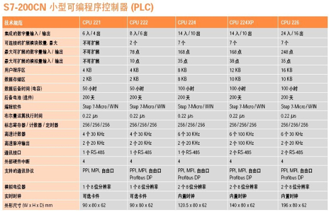 S7-200 CN 系列PLC 可提供4 個不同的基本型號的8種CPU 供您使用。