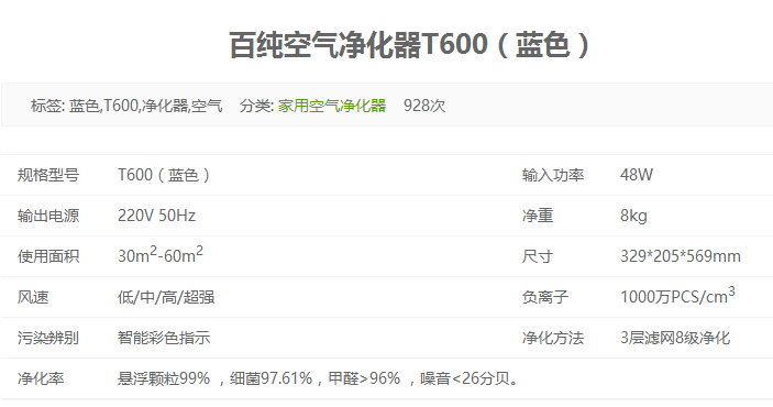 百純空氣凈化器T600(藍色) 百純智能凈化器
