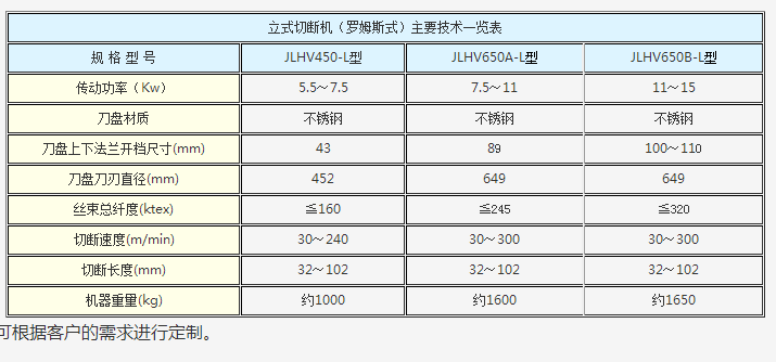 本機(jī)是化纖短纖后加工聯(lián)合機(jī)中的單元機(jī)之一,是將經(jīng)過(guò)曳引張力機(jī)后具有一定張力的長(zhǎng)絲束切成定長(zhǎng)的短纖維,送往打包機(jī)進(jìn)行打包。本機(jī)為立式壓切式切斷機(jī),可按不同槽數(shù)設(shè)計(jì)刀盤,分別能切成棉型中長(zhǎng)及毛型纖維要求的纖維長(zhǎng)度。
