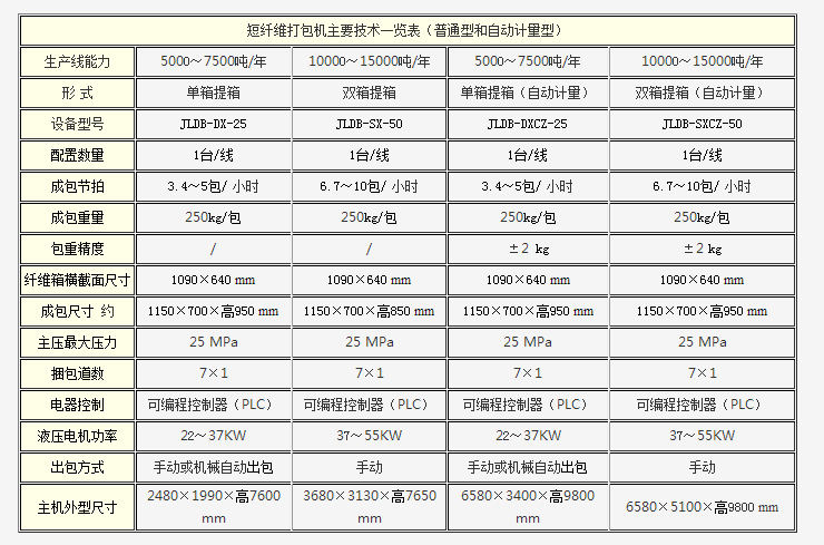 該型聯(lián)合打包機組是一種大型包裝機械。此機為雙箱提箱、半自動(需手動捆包)自動控制及自動計量短纖維打包機,自主研制、開發(fā)的一種半自動打包設備。本打包機通過機、電、液高度一體化實現(xiàn)打包及自動計量。主要供化學短纖維滌綸、腈綸、維綸、錦綸和粘膠等各類化纖短纖維自動打包之用。