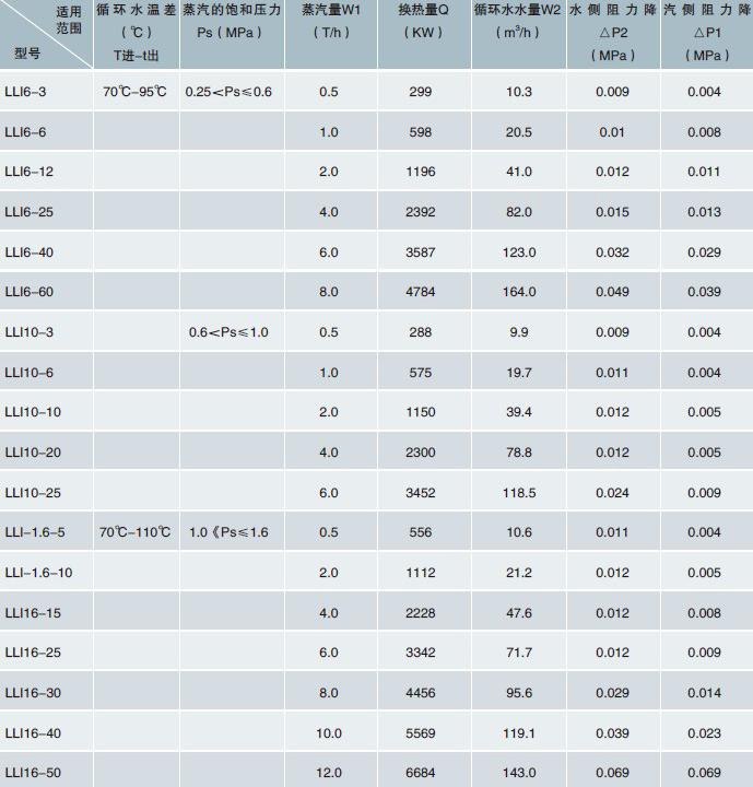 采暖LLI型螺旋板汽-水換熱器使用性能表
