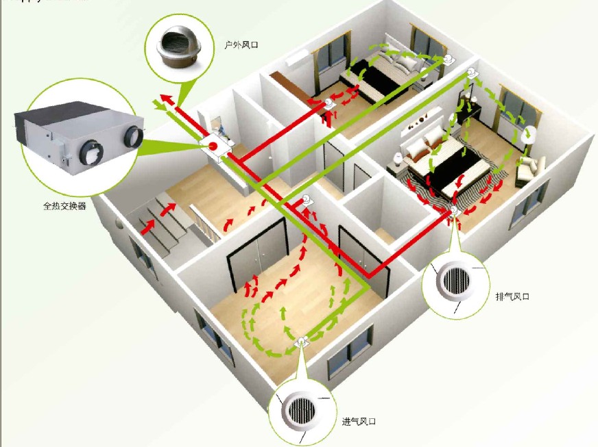 中央新風(fēng)系統(tǒng)是指室外新鮮空氣經(jīng) 過過濾后送到室內(nèi),同一時間把室內(nèi)污濁空氣排到室外,達(dá)到系統(tǒng)的平衡的同時也對房間進(jìn)行了空氣的置換,使一個密閉的空間實現(xiàn)科學(xué)的空氣對流,也等于給你的 房間增加了一個呼吸系統(tǒng)。它保證了在密閉的房間內(nèi)24小時都有清新的空氣,身在房間就如就如置身綠色森林之中一般舒暢,也保證了你的房子更加清潔安靜,隔 絕了室外的灰塵和噪音進(jìn)入房間,又能有效地避免由凝露水引起的房屋發(fā)霉的現(xiàn)象。它有兩種表現(xiàn)方式:一、單向流系統(tǒng);二、雙向流系統(tǒng)(分為帶熱交換和不帶熱 交換)。