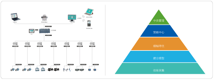 冷 水機(jī)房的耗能主要設(shè)備為冷水機(jī)組、冷水泵組、冷卻水泵組、冷卻塔組,機(jī)房的綜合能耗由每個(gè)單體設(shè)備的能耗累加而成,但是每個(gè)單體設(shè)備的能耗又受到多種因素 的影響。中央空調(diào)深度節(jié)能控制系統(tǒng)采用冷水機(jī)房綜合優(yōu)化算法,跟蹤冷水機(jī)組、冷水泵、冷卻水泵和冷卻塔的性能曲線并結(jié)合末端負(fù)荷需求,對每臺設(shè)備采用主動 式控制和整個(gè)機(jī)房設(shè)備的集成控制,實(shí)現(xiàn)整個(gè)冷水機(jī)房綜合能耗最低的目標(biāo)。在具體的控制策略中,首先根據(jù)冷水機(jī)房內(nèi)各設(shè)備的特性建立各自的能耗數(shù)學(xué)模型,在 此基礎(chǔ)上建立整個(gè)冷水機(jī)房的能量平衡數(shù)學(xué)模型及能耗數(shù)學(xué)模型。在系統(tǒng)運(yùn)行時(shí),控制計(jì)算機(jī)以一定的時(shí)間步長測量制冷負(fù)荷的實(shí)時(shí)值以及其他參數(shù)(例如溫度,壓 力,室外工況,流量等),并據(jù)此進(jìn)行各能耗數(shù)學(xué)模型的聯(lián)合求解,從復(fù)雜多變的多種運(yùn)行組合方式中通過系統(tǒng)子正定確定能夠滿足此制冷負(fù)荷的、且整個(gè)冷熱水機(jī) 房總能耗最低(即整體效率最高)的工作狀態(tài)。在此基礎(chǔ)上,控制計(jì)算機(jī)確定各受控變量的設(shè)定值,并將之傳送到對應(yīng)的下位機(jī)PLC(DDC)中,再由下位機(jī) PLC(DDC)控制各臺設(shè)備的運(yùn)行狀態(tài),使得整個(gè)冷水機(jī)房運(yùn)行在效率最高的狀態(tài)下。強(qiáng)大的數(shù)據(jù)庫背景和完善的數(shù)學(xué)模型來實(shí)現(xiàn)綜合的、非單個(gè)設(shè)備的系統(tǒng)節(jié) 能控制。