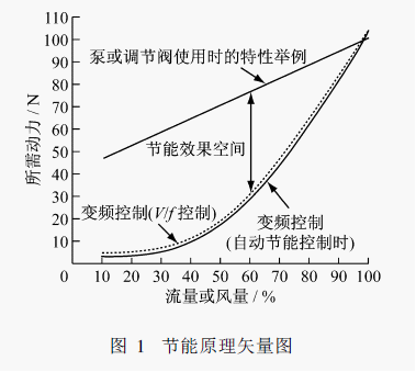 運(yùn)用變頻調(diào)速節(jié)能技術(shù), 變頻調(diào)速器直接控制風(fēng)機(jī)、泵類(lèi)負(fù)載是一種最科學(xué)的控制方法。利用變頻器內(nèi)置的PID 調(diào)節(jié)軟件, 可根據(jù)工藝負(fù)荷精確地自動(dòng)調(diào)節(jié)電動(dòng)機(jī)輸出頻率和轉(zhuǎn)速, 保持恒定的水壓、風(fēng)壓, 滿(mǎn)足生產(chǎn)裝置工藝系統(tǒng)要求的壓力。實(shí)際應(yīng)用證明, 當(dāng)電機(jī)在額定轉(zhuǎn)速的80% 運(yùn)行時(shí), 節(jié)能效率可以達(dá)到40% 。變頻調(diào)速器還可以實(shí)現(xiàn)大型電動(dòng)機(jī)的軟起動(dòng)和軟停機(jī), 避免了電動(dòng)機(jī)起動(dòng)時(shí)對(duì)電力系統(tǒng)的電壓沖擊, 降低了運(yùn)行電流, 不僅減少了電動(dòng)機(jī)、機(jī)泵和閥門(mén)等設(shè)備的故障率, 延長(zhǎng)其使用壽命, 而且節(jié)電效果顯著, 可以取得較好的經(jīng)濟(jì)效益, 實(shí)現(xiàn)了電動(dòng)機(jī)、風(fēng)機(jī)、泵類(lèi)設(shè)備的經(jīng)濟(jì)運(yùn)行。其節(jié)能原理矢量圖見(jiàn)圖1。