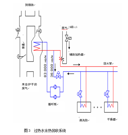 該余熱回收系統(tǒng)回收的熱能,基本上已經(jīng)滿足了清洗工藝的用能需要,但是在產(chǎn)能較大的時候,煙氣溫度很高,有時為了確保熱交換器不因過熱受損,必須要用大量 的純水來冷卻熱交換器,經(jīng)過熱交換器的熱水大于本機組其他工序的用熱水量,因此,多余的熱水就只有白白排放,反而造成水資源的浪費。