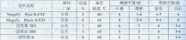染色后皂洗工藝:皂洗劑2g/l,浴比1:20,溫度85-95℃,時問20分鐘從上述選擇的活性染料進行各項牢度試驗來看,ELE型、HF型和B型染 料均是以共價鍵的形式與纖維結合,按照常規(guī)加鹽加堿的方法,充分皂洗去除浮色,各項牢度指標都能達到3級以上,其中ELE型和B—EXF型活性染料最為理 想。