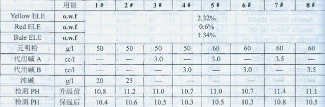 其次觀察兩種不同堿劑工藝的上染變化情況,實驗得出,代用堿A、B的用量為碳酸鈉1/6和1/7左右時,染色的上染率和碳酸鈉固色工藝結果稍微有變化, 特別在代用堿的用量為碳酸鈉用量比例在1/6時基本接近,但是從3≠f至6≠}結果中發(fā)現(xiàn),使用相同用鼉的代用堿劑時,適當增加元明粉的用最可以使上染率 得到改善。綜合各項染色性能來看:7#8#的代用堿固色工藝的效果良好。