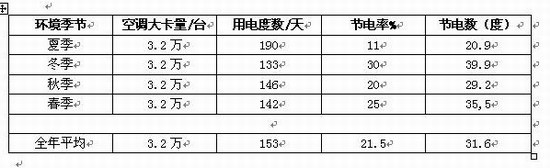 根據(jù)大連網通機房近幾年的空調用電數(shù)據(jù)統(tǒng)計,1臺3.2萬大卡的空調,夏季耗電190度/天,冬季耗電133度/天。全年平均耗電153度/天。夏季比冬 季耗電量高40%左右。下表數(shù)據(jù)可見,不同季節(jié)的節(jié)電率是不同的,而且節(jié)電度數(shù)的絕對值也是不同的。事實上,白天和晚上的耗電量都是不同的。