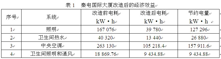 秦電國際大廈針對其公共區(qū)域照明、衛(wèi)生間照明及生活熱水、排風(fēng)、中央空調(diào)系統(tǒng)存在問題進(jìn)行了一系列的節(jié)能改造并取得了極大的節(jié)能效果。