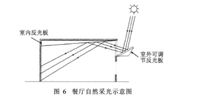 把天然光引進室內(nèi)照明,不僅節(jié)約資源,保護環(huán)境,還可以創(chuàng)造出舒適的光照環(huán)境,有益于身心健康。大面積的窗戶采光較好,但也會帶來更多的熱損 失。窗戶的數(shù)量和面積應(yīng)根據(jù)建筑形式處理要求、自然光照和能耗等綜合確定。比較合理的經(jīng)驗值是窗戶面積為室內(nèi)面積的20%左右。相對于墻面上的窗戶,透明 屋頂將提供更好、更廣泛的自然照明,但容易引起室內(nèi)溫度過高。停車場的運用檢修庫、洗車庫等 操作工區(qū)若選擇在屋面頂部安裝噴灑蒸發(fā)裝置,可考慮采用由陽光板或亞克力材料制作的透明屋頂,或增加采光帶的面積,以獲得更好的照明效果。此外,辦公樓采 用玻璃中庭向上部分逐漸擴大,將能獲得更多的自然光線。進深較大的餐廳或開放式辦公區(qū)為充分利用自然光,在必要的情況下可利用反光板采光,如圖6所示。