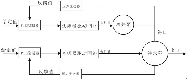 通常油田注水站注水泵流量大多采用傳統(tǒng)的水源井深井泵,將水供到儲水大罐,再由喂水泵將水從儲水罐供給注水泵,最后由注水泵將水注入地層。注水泵電機(jī)大多為大功率電機(jī),注水泵出口壓力通常是通過調(diào)節(jié)閥門實現(xiàn),操作人員隨時靠觀察壓力表的壓力來調(diào)節(jié)閥門,而水泵電機(jī)的額定轉(zhuǎn)速基本保持不變,這樣,對電機(jī)而言,浪費電能現(xiàn)象十分嚴(yán)重,管網(wǎng)水泵多,流程復(fù)雜,浪費電能又增加了操作人員的勞動強(qiáng)度。