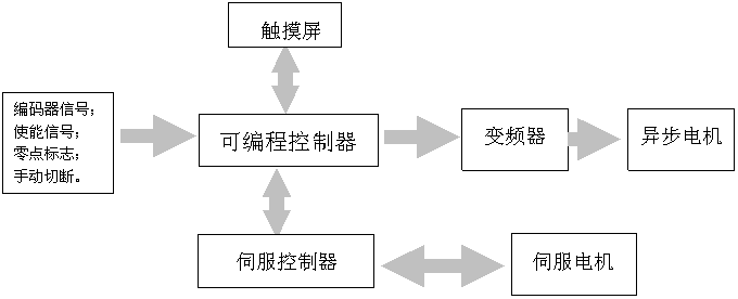 2.選用臺灣永宏(FBS-20MNT)微型可編程控制器(PLC- 20點,12入8出)作為上位機,接收定長編碼器(1024線/DC5V)的脈沖信號,并經(jīng)內(nèi)部編程后將速度脈沖傳給伺服控制器,伺服控制器根據(jù)該信號編程后同步控制伺服電機,達到速度同步的要求;同時上位機將長度信號編程與觸摸屏設(shè)定的長度L1比較后給出信號,控制伺服電機帶動切料輥工作;