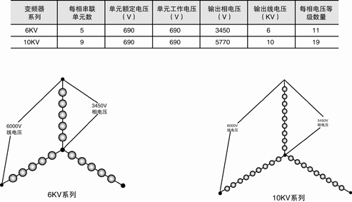 HY高壓變頻器每相由多個(gè)功率單元串聯(lián)而成,各個(gè)功率單元由隔離變壓器的二次線圈分別隔離,移相電源通過(guò)改變串聯(lián)單元數(shù)量,可以很方便地得到不同電壓等級(jí)的輸出,而不受功率器件耐壓的限制。如額定電壓6kV變頻器的每相由5個(gè)功率單元組成,功率單元額定電壓為690V,串聯(lián)后相電壓為3450V(對(duì)應(yīng)線電壓為6kV);額定電壓10kV變頻器的每項(xiàng)由9個(gè)功率單元組成,功率單元額定電壓為690V,工作電壓為640V。